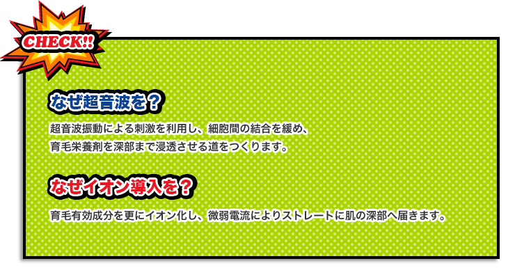 スクライバーによる超音波導入とイオン導入を同時に行うことで、発毛に必要な栄養を毛乳頭に確実に届けるとともに、