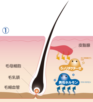 ホルモンのバランスが崩れる事により5αリダクターゼ(皮脂腺から分泌)と男性ホルモン(テストステロン)とが結合します。