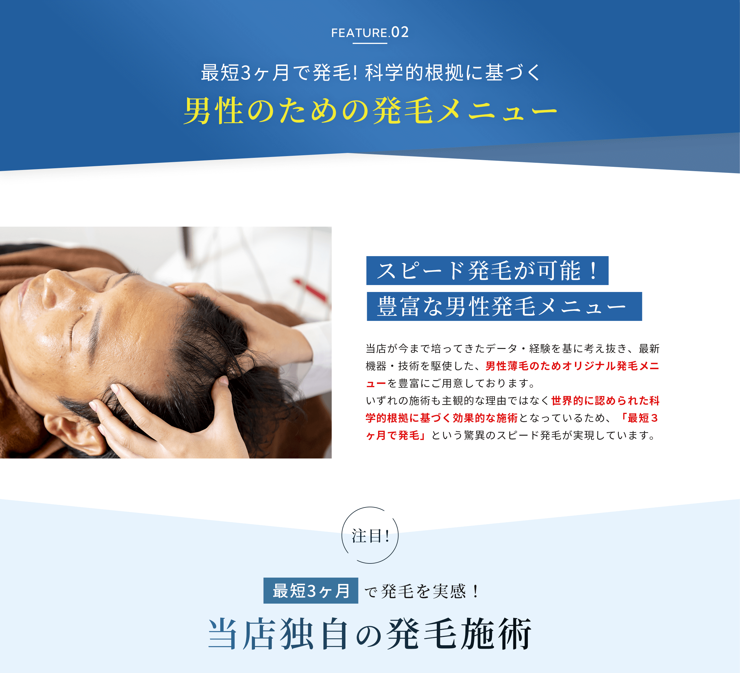 薄毛が進行し始めて期間が短い方は約3ヶ月で発毛を実感していただけます。薄毛の進行期間が長い方は6ヶ月以上かかる場合もございます。