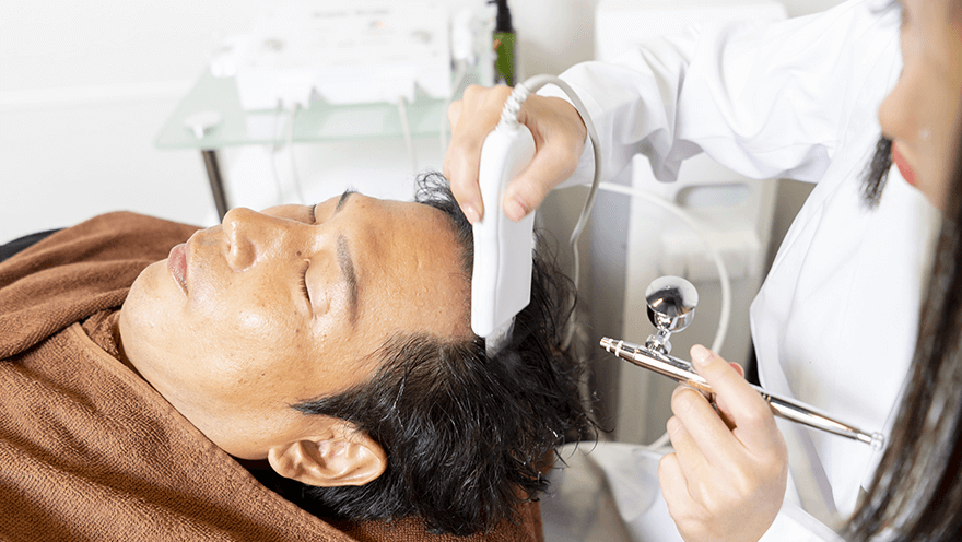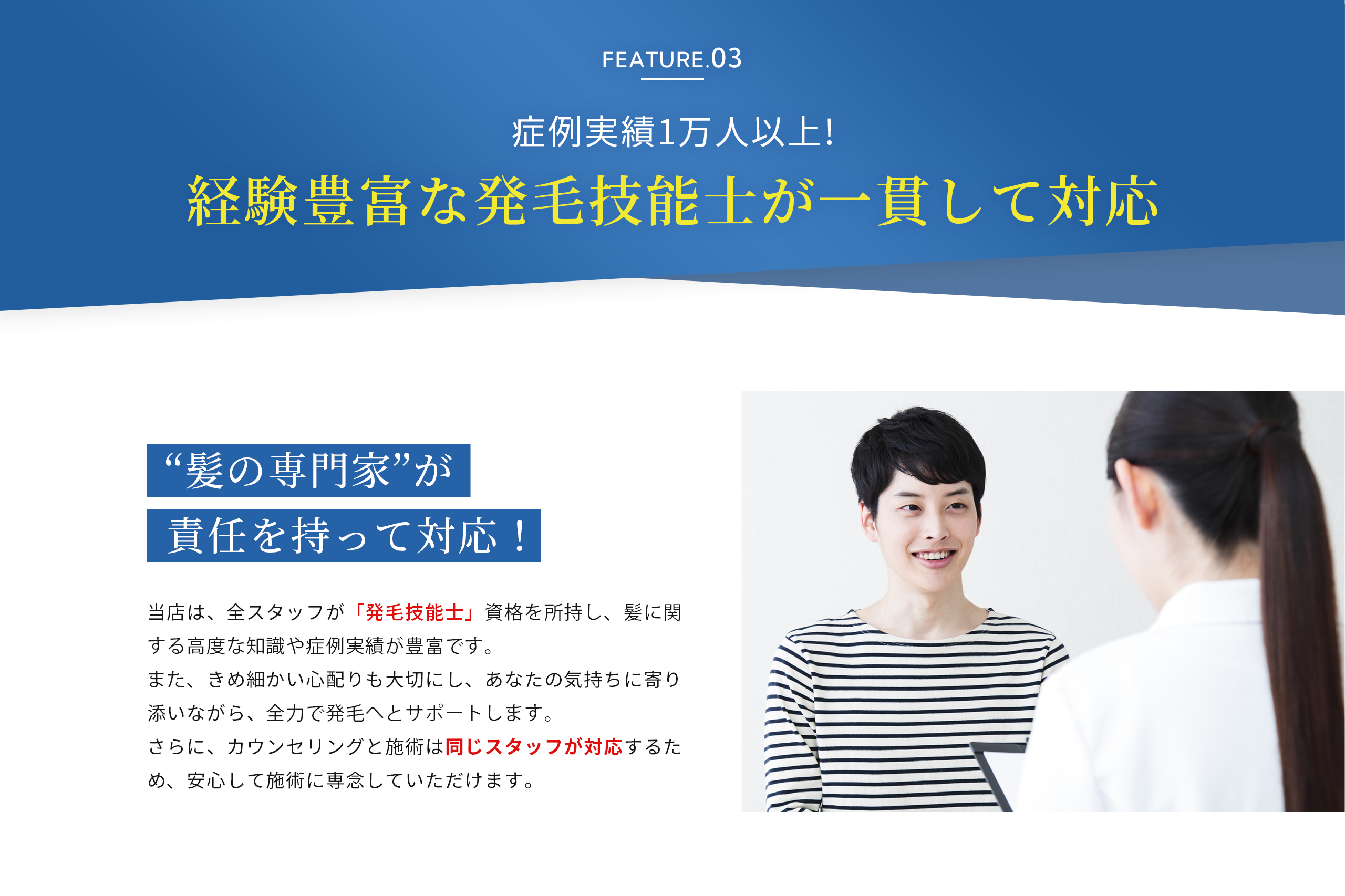 過去に多くの男性を発毛に導いてきた発毛技能士が、情報をもとにお客様の薄毛の原因を徹底分析し、あなたに合った発毛のためのコースをカスタマイズし、ご提案いたします。施術内容にしっかりとご納得いただけましたら、お申し込みいただきます。