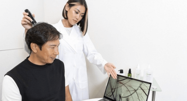 毛根と頭皮の状態を詳しく見るためにマイクロスコープによる頭皮チェックを行います。 また血行不良が薄毛の原因に考えられるお客様には、毛細血管の血流診断を行い、お客様の新陳代謝や老廃物の蓄積具合をチェックすることが可能です。