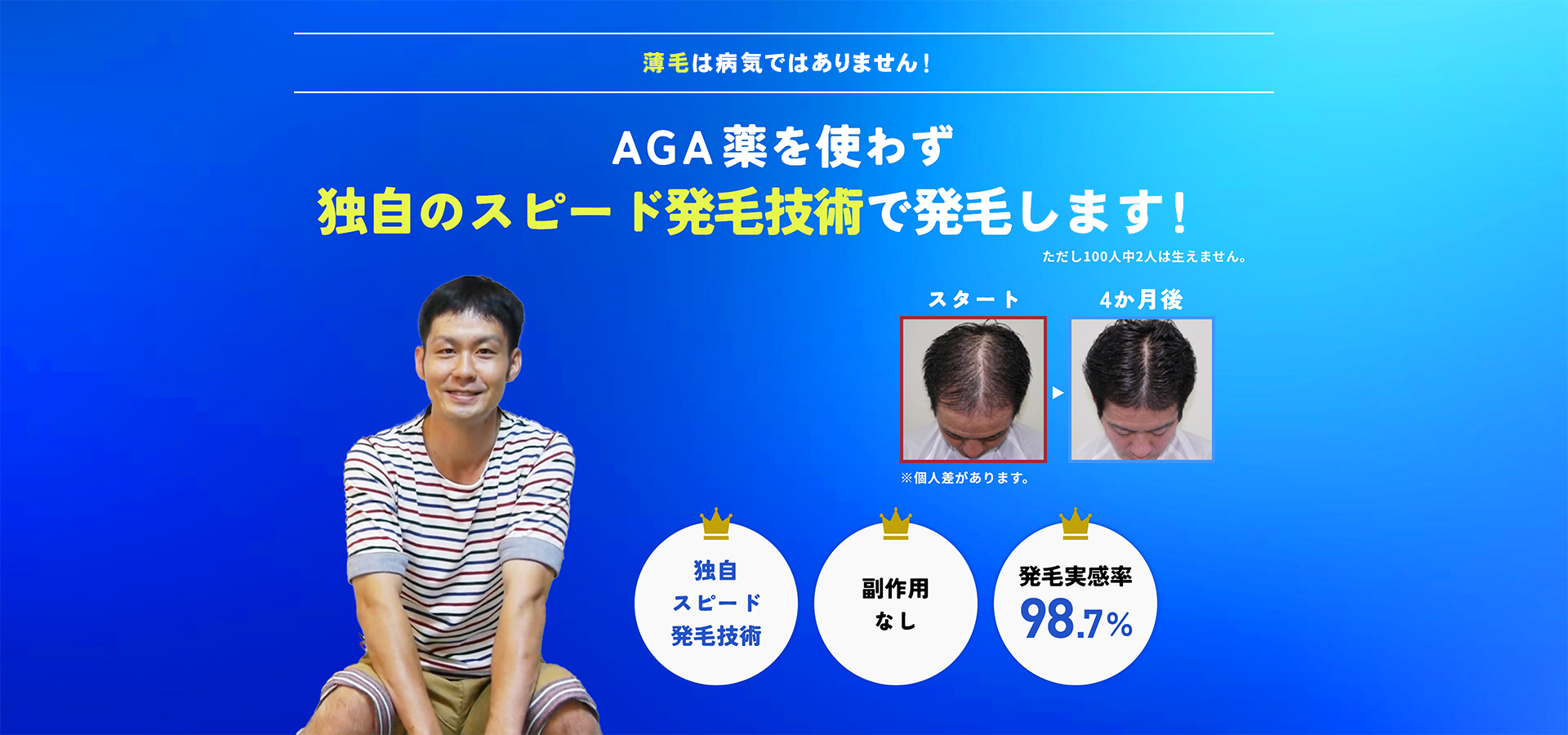 副作用などのリスクを考慮しAGA治療薬を使用せず薄毛進行前のご自身の毛髪に戻す独自のスピード発毛技術が選ばれる理由です。