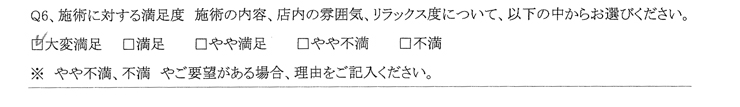Q.施術に対する満足度、施術の内容、店内の雰囲気、リラックス度についてお答えください。