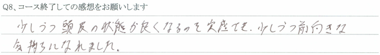 - A.少しずつ頭皮の状態が良くなるのを実感でき、少しずつ前向きな気持ちになれました。