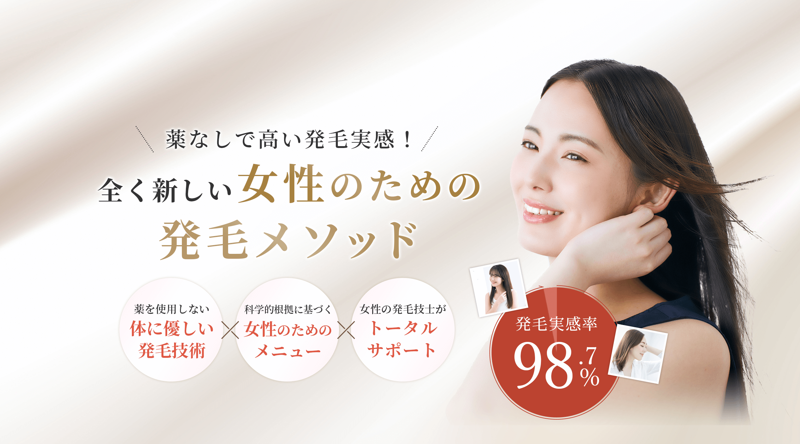 女性のための発毛メソッドとは、薬を使わずに根本的かつ総合的に薄毛を解決することができる発毛技術をベースに、科学的根拠に基づいた女性のための発毛メニューと、経験豊富な女性の発毛技能士によるトータルサポートが組み合わさることで、発毛実感率98.7%という圧倒的な結果へと繋がっている方法です。クリニックや他の発毛サロンには真似することができないメソッドで、多くのお客様を発毛へと導き、喜びの声をいただいております。
