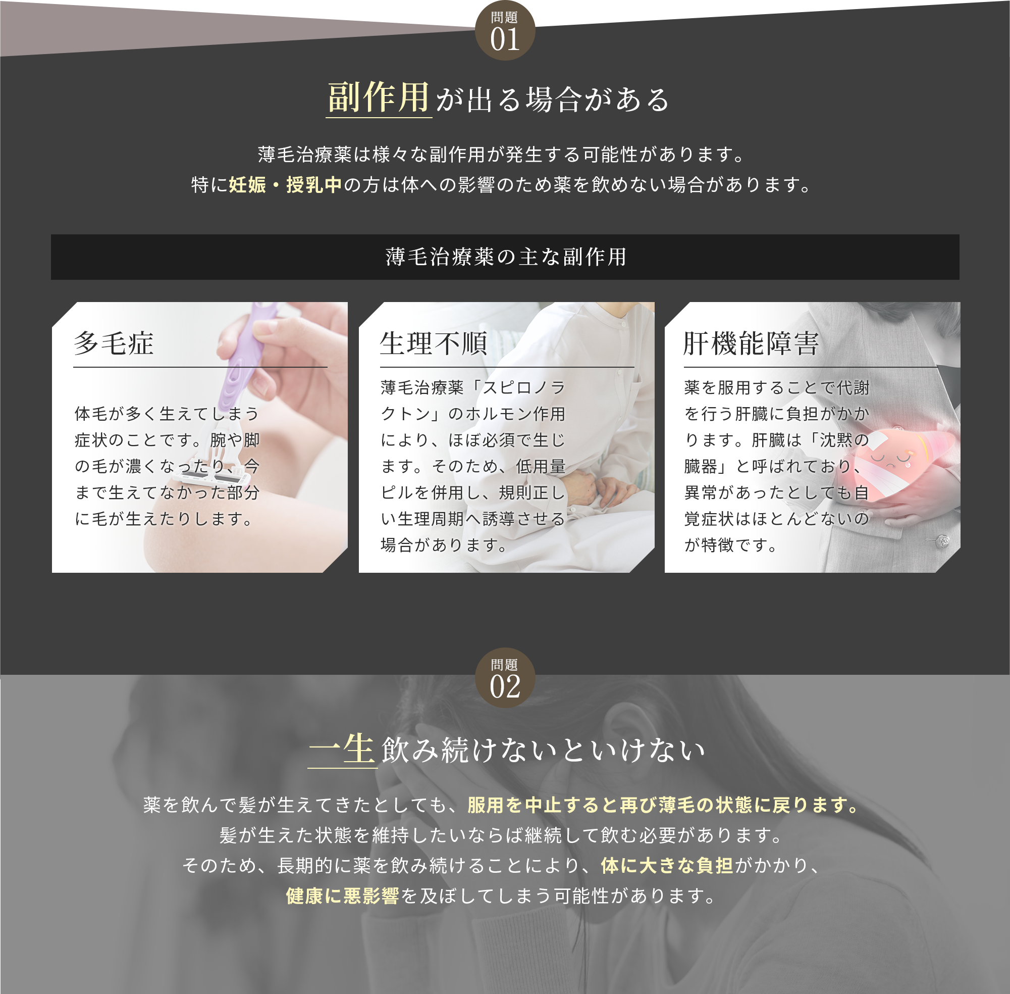 薬による治療は、その効果によって一時的に症状を改善させている状態です。あくまで対症療法となり、服薬を止めることで再び薄毛の状態へと戻るため、根本的な解決策にはなりません。
