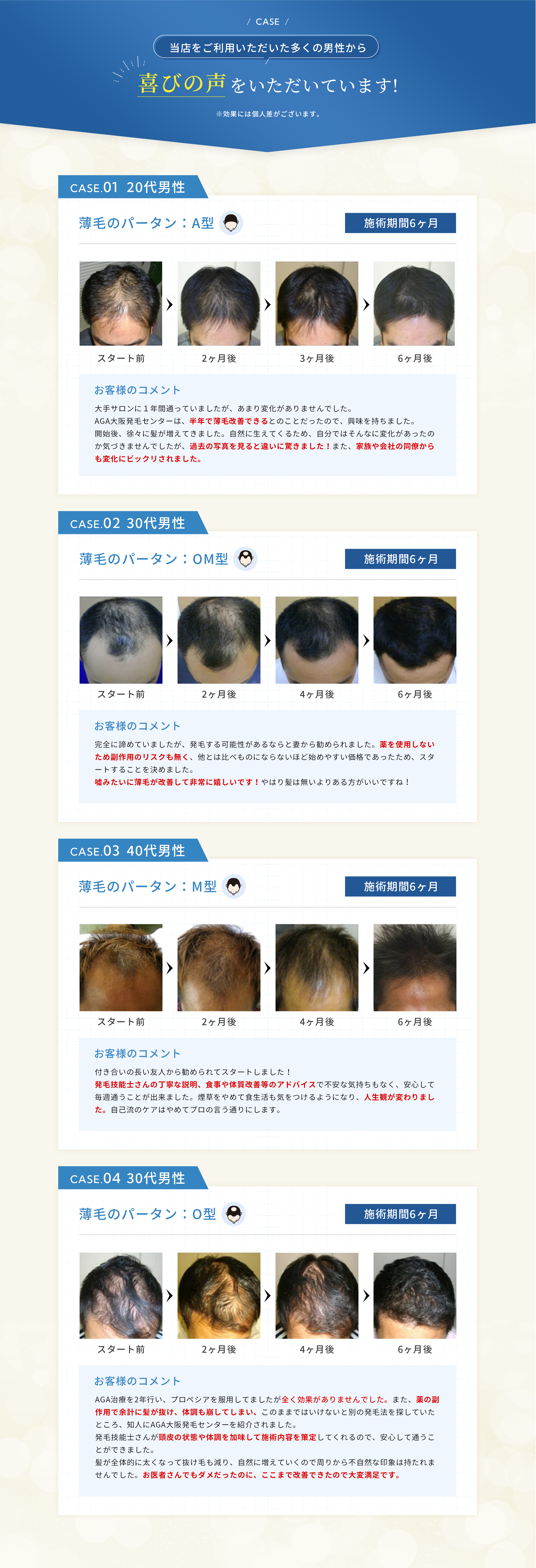 薄毛が進行し始めて期間が短い方は約3ヶ月で発毛を実感していただけます。薄毛の進行期間が長い方は6ヶ月以上かかる場合もございます。
