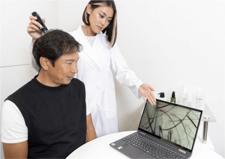 毛根と頭皮の状態を詳しく見るためにマイクロスコープによる頭皮チェックを行います。 また血行不良が薄毛の原因に考えられるお客様には、毛細血管の血流診断を行い、お客様の新陳代謝や老廃物の蓄積具合をチェックすることが可能です。
