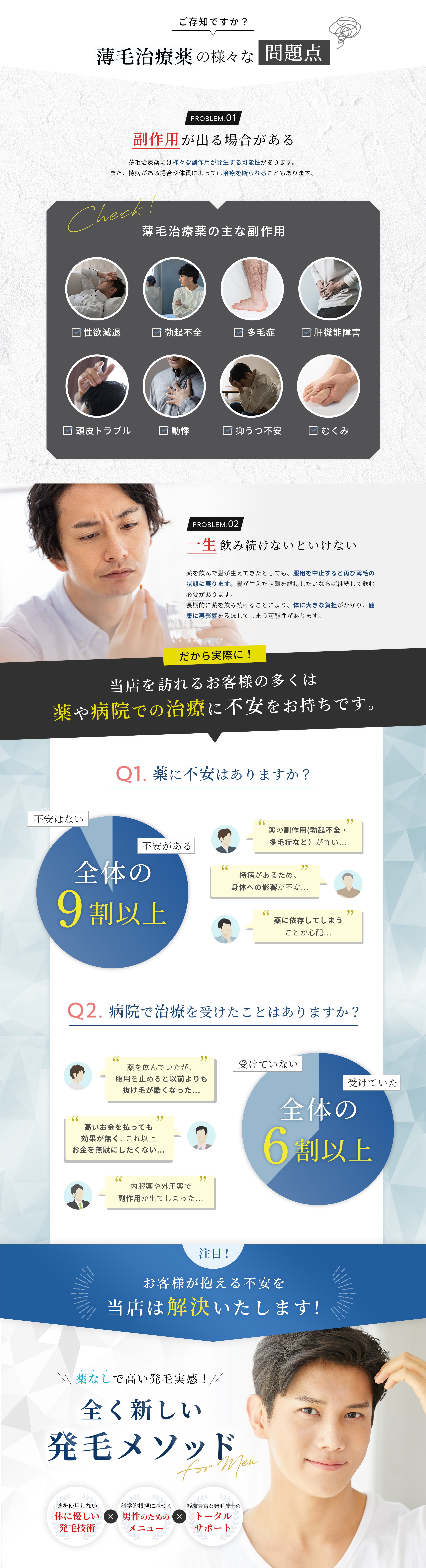 当店の施術は薬を使用しませんので、勃起不全・多毛症・肝機能障害など、薬による様々な副作用が発生する心配がございません。体への影響が不安な方でも安心して受けていただけます。またAGAクリニックによっては注射器を使用し、発毛有効成分を頭皮に注入するといった治療が存在し、痛みを伴う場合もありますが、当店には痛みが発生する施術は一切ございません。痛みが不安で薄毛改善を諦めている方は、ぜひ当店にご相談ください。